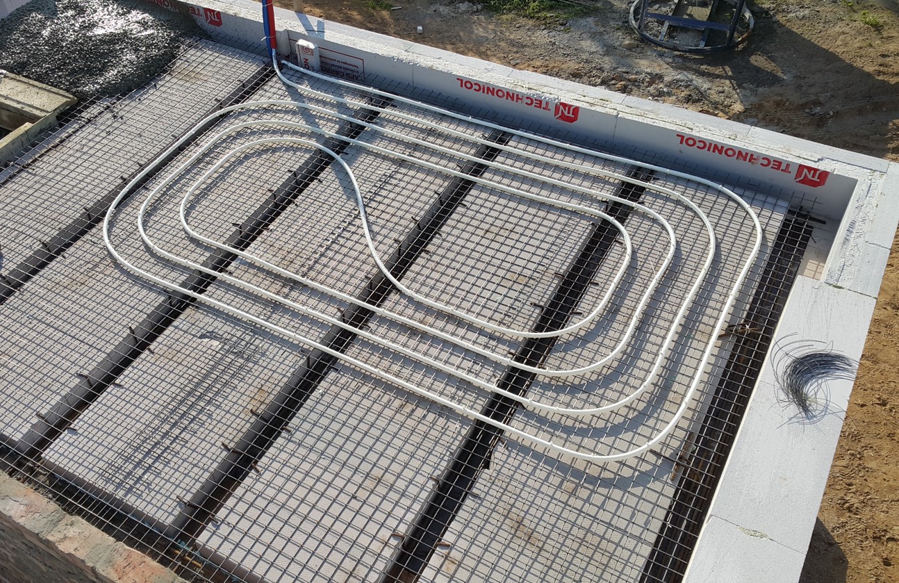 По этой причине выработали другую концепцию, в которой теплому полу отводится роль фонового, но основного источника тепла. На смесительном узле устанавливается привод-контроллер с погодозависимым управлением Esbe 90C, который настраивается так что бы недотапливать помещения, при этом он меняет температуру теплоносителя в зависимости от погодных условий – основного фактора динамики теплопотерь. Также применяется ещё ряд т.н. «лайфхаков» собственной разработки. Стяжка, в которую укладывается труба теплого пола, должна быть максимально пластичной, в идеале – бетон, толщиной не менее 80 мм. Шаг укладки трубы диаметром 20 мм (уменьшение гидравлического сопротивления по сравнению с трубой 16 мм и увеличение площади теплообмена трубы со стяжкой) выполняется в 2 раза больше традиционного, например, при укладке змейкой 30 см. За счет значительно большей, чем у полусухой стяжки, теплопроводности бетона градиент температуры на поверхности пола практически незаметен. Для реализации необходимого теплового потока температура теплоносителя устанавливается выше традиционной. Это позволяет при соблюдении нормативов (температура на поверхности пола не более 28 градусов) выполнить по настоящему эффективные зоны с повышенной температурой за счет уменьшения шага укладки и применения двух армирующих сеток, под и над трубами ТП, для лучшей теплопередачи – около входной двери, окон в пол (лучше и дешевле, чем внутрипольные конвекторы). Другой «лайфхак» — на этапе проектирования закладываются петли теплого пола приблизительно одинаковой длины. В этом случае отпадает необходимость значительно зажимать более короткие контура под гидравлическое сопротивление самой длинной петли, а соответственно, уменьшить гидравлическое сопротивление системы в целом, снизив нагрузку на циркуляционный насос. Целесообразно применять циркуляционные насосы с частотным управлением. Такие насосы даже на постоянной скорости экономят потребление энергии по сравнению с насосами UPS.