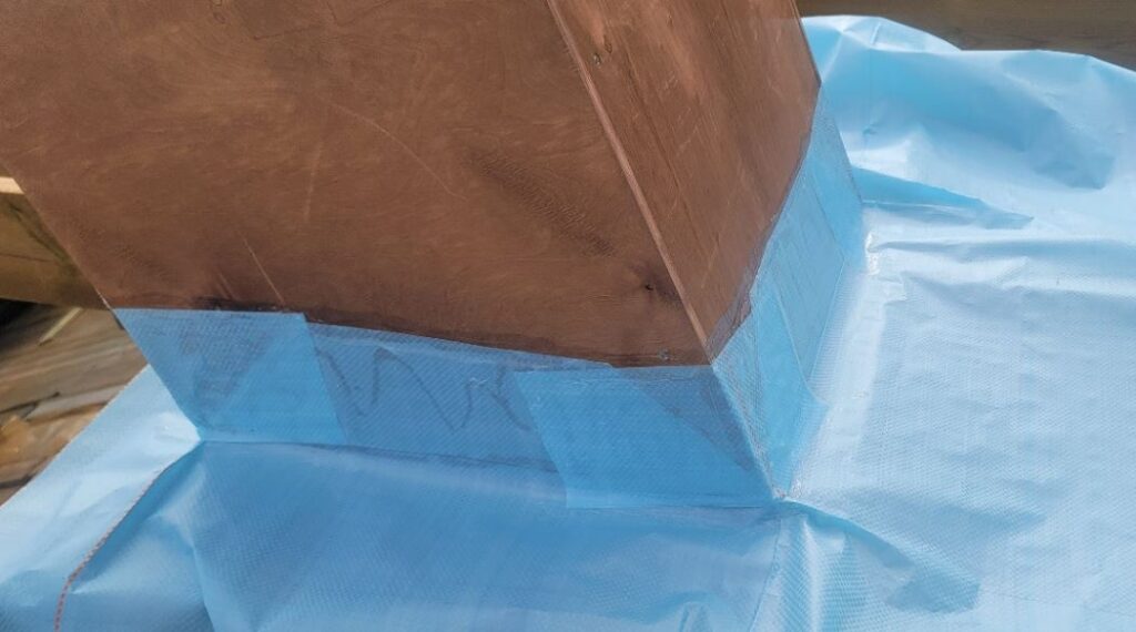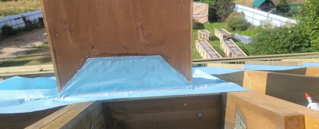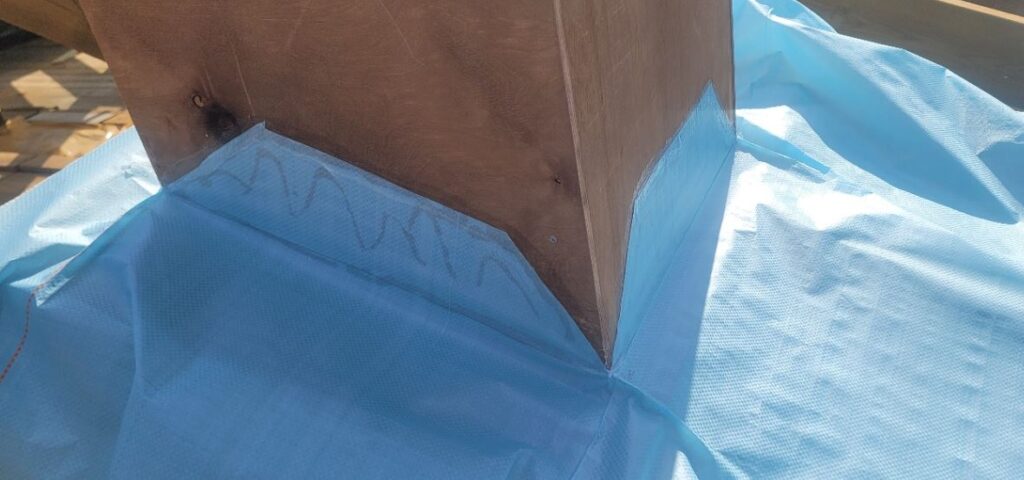 Вариант узла примыкания гидроизоляционной плёнки к трубе. Плёнка Eltete Elkatek 150S, жесткая, не эластичная совсем, поэтому выбрали вариант со склеенной складкой. Клей — Titan ClassicFix, проверенное более, чем десятилетием решение.
